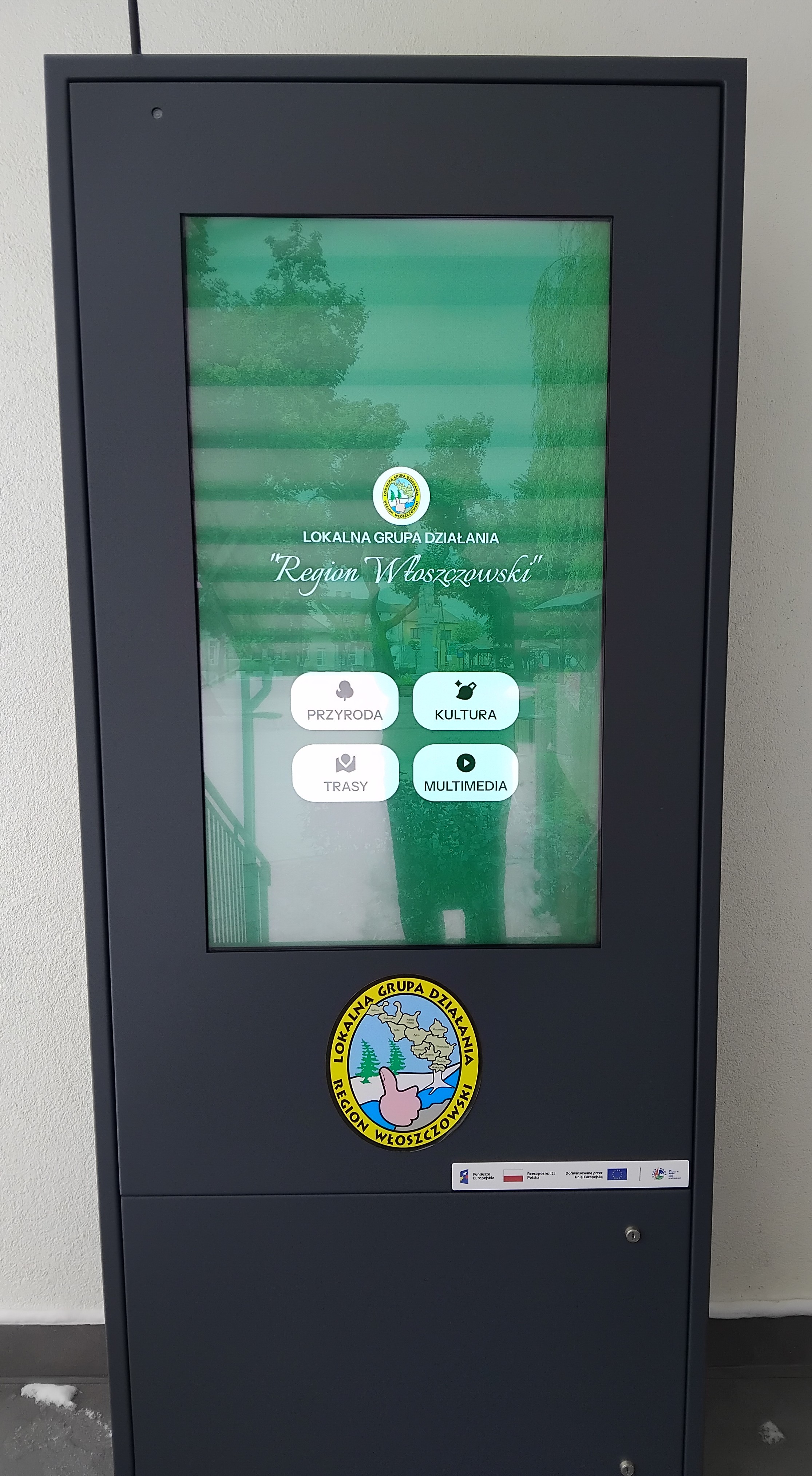 Kolejnym zadaniem projektu był zakup i montaż kiosku informacyjnego, przystosowanego do całorocznej pracy na zewnątrz. Kiosk został umiejscowiony na podeście schodowym przed drzwiami wejściowymi do Biura LGD i pełni funkcję zewnętrznego informatora dla mieszkańców oraz turystów.