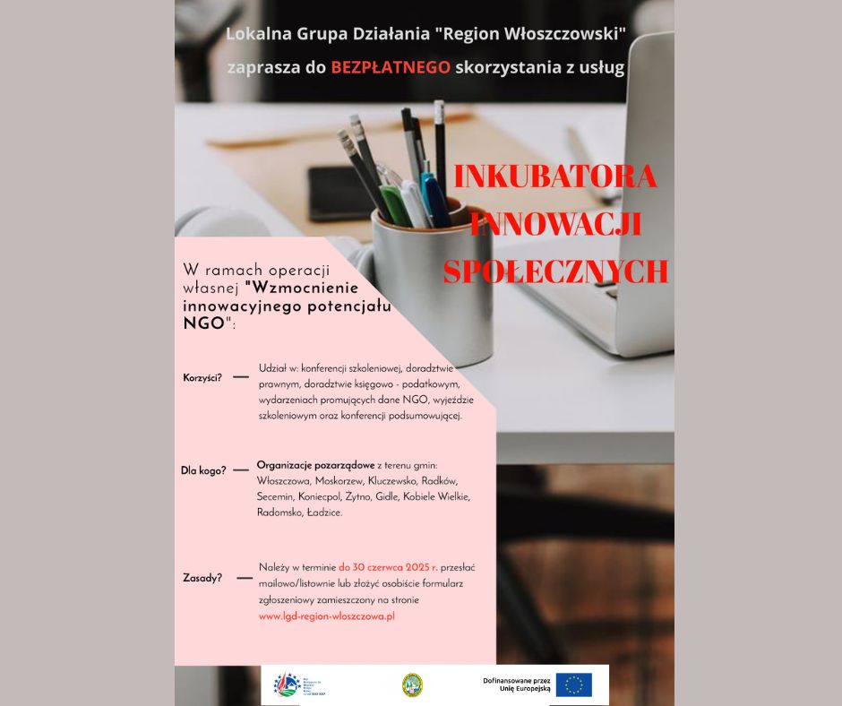 Lokalna Grupa Działania „Region Włoszczowski” zaprasza organizacje pozarządowe z terenu gmin: Włoszczowa, Kluczewsko, Radków, Moskorzew, Secemin, Koniecpol, Żytno, Gidle, Kobiele Wielkie, Radomsko, Ładzice do bezpłatnego uczestnictwa w operacji własnej pn. „Wzmocnienie innowacyjnego potencjału NGO”.